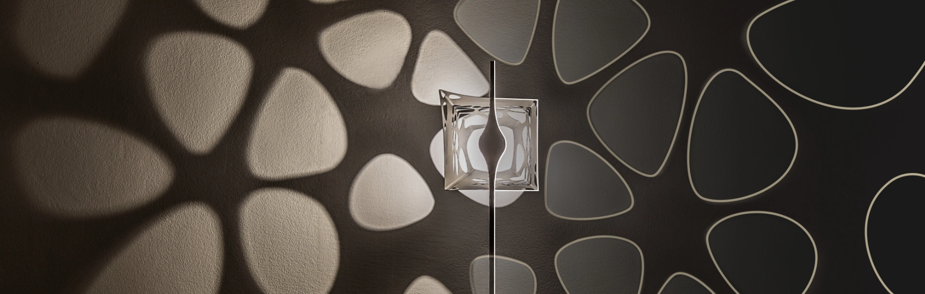 Bloom Q is designed as a wall or ceiling lamp, casting a unique light onto its background. The shadow pattern can be mounted individually in alignment, and has a projection size of approx. 2x2m. The shape of the lamp results from calculating the shadow pattern and is cut from a stainless steel tube, using the latest laser technology.